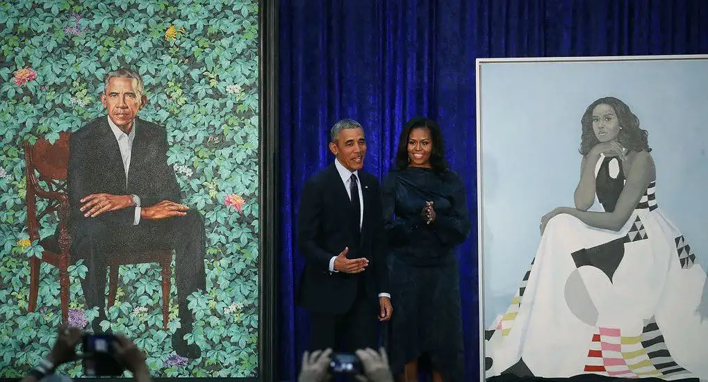 Barack’s portrait was painted by Kehinde Wiley, an artist best known for his vibrant, large-scale paintings of African-Americans, in which the subjects sit in fantastic, often ornate settings. Michelle’s was painted by Amy Sherald, a Baltimore-based artist known for her vibrant use of colour and for giving her predominantly African-American subjects a greyscale skin tone.