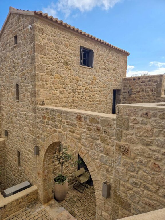 erched above the shimmering bay of Neo Oitylo, in a village untouched by mass tourism, Korona Boutique Hotel is a soulful mosaic of impeccably restored stone houses scattered throughout the historic alleys of Oitylo. More sanctuary than hotel, this design-forward hideaway is the work of the Empiria Group—the same visionaries behind Vedema and Cosme—and channels the spirit of Mani with reverence and restraint. Inside each tower suite: creamy linens, hand-thrown ceramics, and an atmosphere of contemplative calm. Mornings begin with homemade pies prepared by local women and unfold into slow, sun-drenched afternoons on sea-view terraces with a glass of Moschofilero in hand. Come October, the village slips into golden quiet, wild herbs scent the breeze, and the experience feels less like a vacation and more like being gently folded into the rhythm of an ancient landscape.