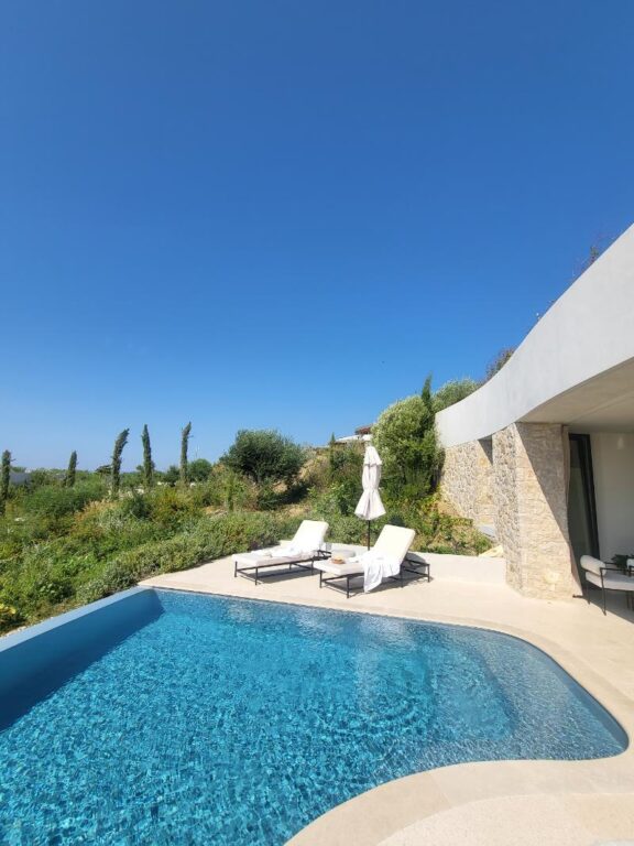 A bold reinvention of Greece’s industrial past, Dexamenes is one of the country’s most architecturally arresting hotels. Former wine tanks have been transformed into sleek, steel-and-glass suites that open onto the sea. The aesthetic is minimalist but deeply emotive—raw concrete softened by linen, bronze, and driftwood. October adds a moody charm: morning walks on the empty beach, golden hour that flatters every architectural angle, and fire-lit wine tastings in the evening. This is a destination for design aficionados, slow travelers, and anyone who dreams of sleeping inside a sculptural masterpiece.