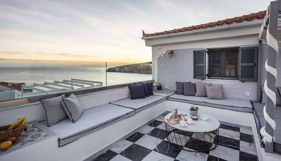 Standing on a privileged location, on the most elevated and precipitous edge of the rock, one has the feeling of travelling through both waves and time.An old fortified tower, built during the era of Venetian occupation, ensures full oversight of the peninsula and the gulf and creates a feeling of anticipation for an impending pirate attack.Luxurious hand-made signature furniture by N. Haritos, hand-made mattresses by HYPNOS brand, artwork that resonates the seafaring tradition of Andros and atmospheric lighting; all these elements are combined in an idyllic scenery, ready to satisfy even the most demanding taste.With comforts that exceed expectations, the suites promise to offer travelers an experience of total relaxation, with sounds and hues of the sea rarely felt in such depth before. How the vision of CAMARA SUITES came into reality.Driven by my love for the island, and particularly the old town area (Chora), where I spent my childhood and school years, in combination with my affection of education and civilization, my area of professional activity, I came up with the concept of Camara Suites.Andros is a place of civilization and history. This is evident on first sight of Chora and its architectural masterpieces. Having been fortunate enough to have been raised in, and assimilate, such a cultural environment, I strongly felt the need to preserve and share these “treasures” with others.Camara Suites is a personal vision, aiming to make use of and showcase this cultural wealth, which constitutes an authentic experience for guests and guarantees a unique choice of accommodation.Louisa Diapouli.