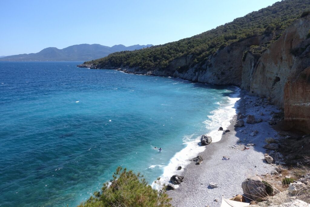 What is certain is that the effort is compensated with a beach boasting large white pebbles and wonderfully calm waters, which deepen sharply about 5 metres from the shore.