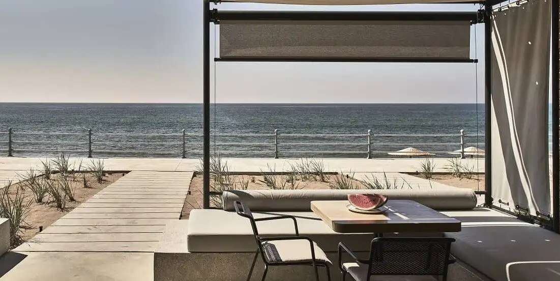 The internal layout of the sea-front tanks makes the most of their immediate connection to the beach, with beds centered on the large sliding window looking directly out over the water and a privately framed view of the sunset from beneath the canopied patio. They are connected by a wide promenade walkway raised above the sand, leading to the other parts of the hotel and down to the beach. Even the promenade railings play their part in the design, featuring parts of the reclaimed irrigation system originally installed on the tank roofs.