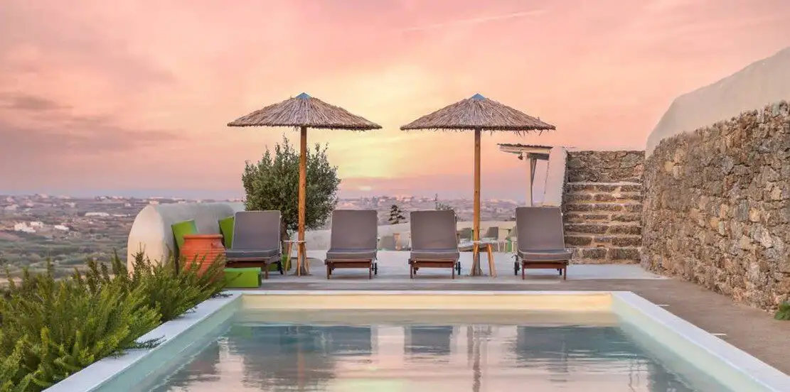 The Halcyon Villas is a brand new luxury boutique hotel built on a superb hillside with panoramic mountain and sea views.It consists of two villas and two suites. Each villa is approximately 130 sq.m. and can accommodate 2-7 guests and each suite is approximately 70 sq.m. and can accommodate 2-4 guests. The complex is decorated with refined taste by respecting one culture of the Cyclades and on the other providing luxury and comfort. The villas have an indoor pool and indoor spa hydrotherapy horizontal shower. There is a large outdoor pool, private courtyards, garden and our priority is our guests have an upper class experience and staying stay etched in their mind.Friendly service, breakfast with organic products from our farm and if desired meal with baked bread kneaded and baked in a restored watermill and our oven is some more that will contribute to our guests’ holidays unforgettable stay.