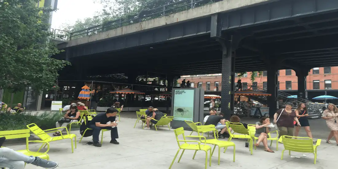 Lush greenery above gives way to cobblestone streets, seafood and shopping below the High Line’s first entrance.The entrance is the beginning point for park tours, departing Tuesdays at 6:30pm and Saturdays at 10am from May through September.