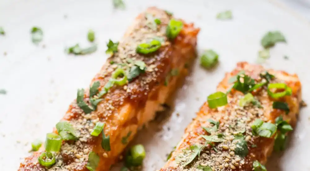- Broil the salmon until just cooked through, about 6 to 8 minutes depending on size. Garnish with scallions, cilantro and gomasio. Serve immediately.