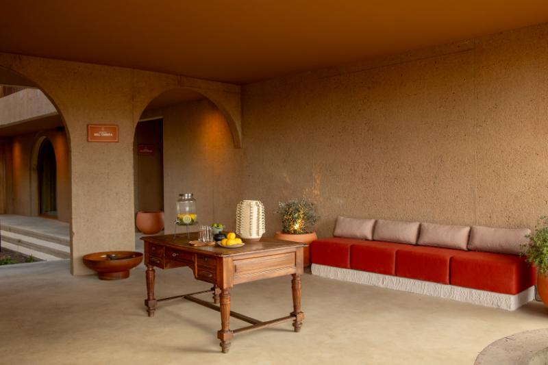 35 rooms arranged across several low-slung buildings, their green roofs stepping with the slope so the hotel blends into the hillside rather than crowning it. A patio shaded by a mature belombra tree anchors the promenade up to the restaurant, bar, spa and the duo of indoor–outdoor pools.