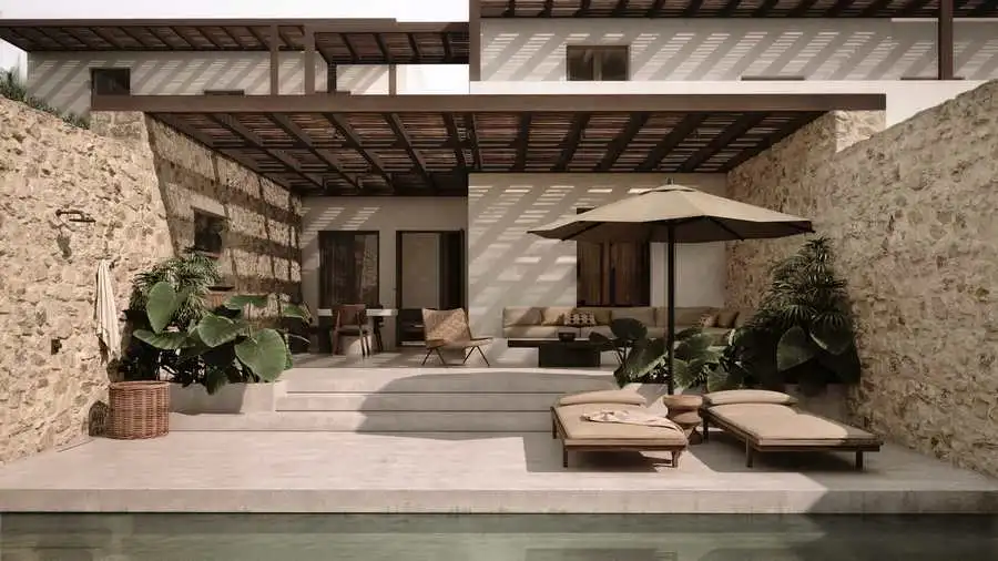 The first property, Luura Cliff, will open in April 2026 on Paros’s west coast with just 39 rooms. Designed by Elastic Architects and Lambs and Lions (Berlin’s cult interior studio), the hotel takes inspiration from classic Cycladic architecture—but reimagined as a contemporary village constellation. Think minimalist white volumes, layered textures, and shared spaces that feel both intimate and intentional.