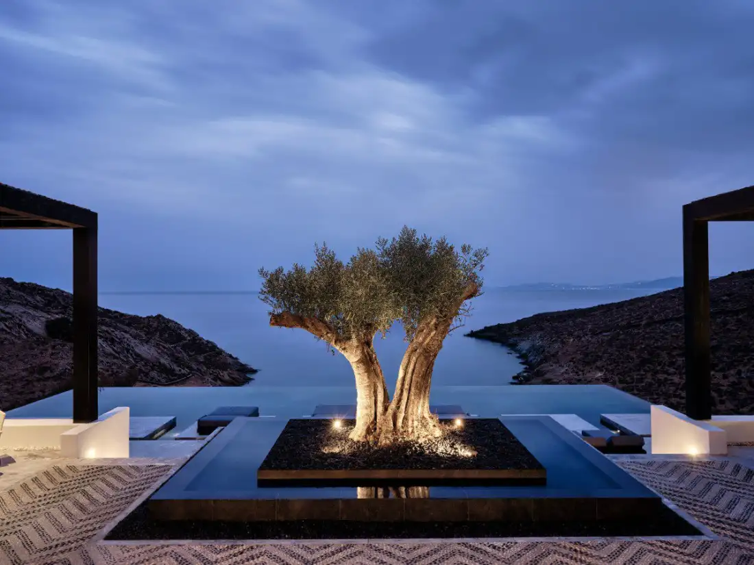 This is Greek summer 2.0—updated with a touch of modern pampering. Imagine curtains that open automatically to unveil a theatrical view of the entire bay and an unobstructed horizon of the Aegean Sea. Soft sun loungers and a buggy to transport you from and to the beach (though we always walked to capture photos, admire the scenery, and breathe in the scents of local herbs and bushes). A grand carob tree with a thick trunk dominates and becomes the hotel’s landmark, reminiscent of the courtyards of captain’s houses. This majestic tree, set on a beautiful pebble mosaic, became a focal point for my mornings and evenings, changing with the light and evoking a deep sense of tranquility. Every detail reflects the island’s spiritual and cultural heritage, making the space feel both elevated and deeply connected to its surroundings. The serene atmosphere of the hotel’s terrace, adorned with bamboo chairs and marble tables, instantly transported me back to memories of easy breezy evenings at elegant hotel verandas. These are the vacations that linger in the heart long after they’ve ended.