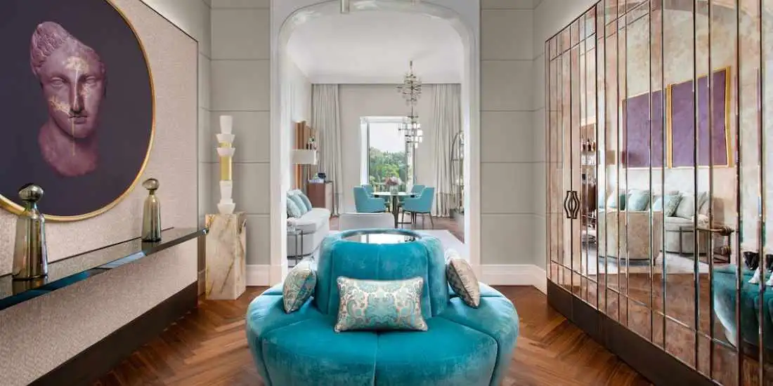 Her interiors respectfully blend with the historic features of the Hotel, bringing contemporary elegance to the spaces. Her design is characterized by light colours and neutral tones, occasionally peppered by vivid colours, such as the coral red in the main hall, Sala Della Grande Madia, and aqua green in the Princess Cecilie Suite.