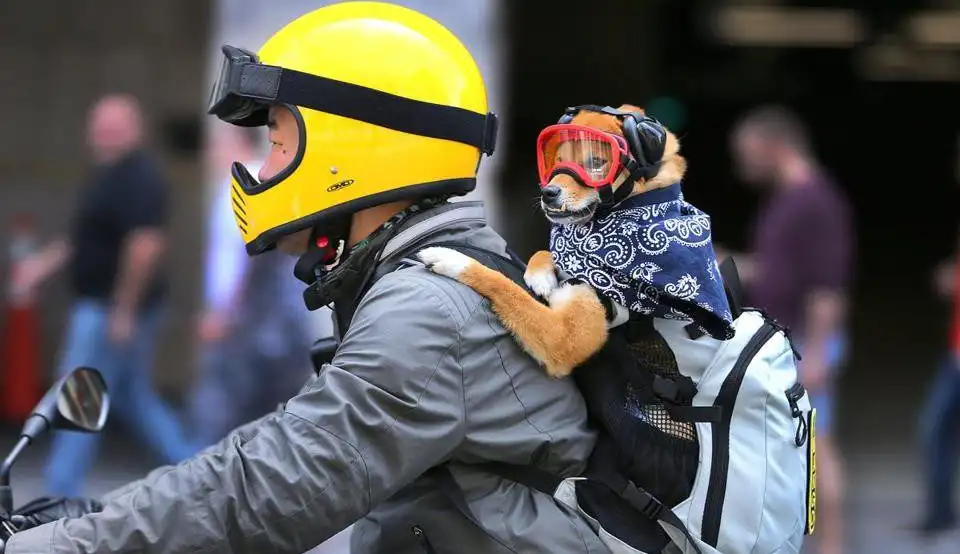 Sang Lee of Somerville rides his motorcycle down Boylston Street in the Back Bay with his dog, Mango, holding on in a backpack.
