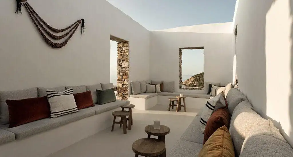 Inspired by the raw natural beauty and the rustic charm of the place, The Rooster focuses on tranquility. Its 17 houses are in perfect harmony with the surrounding landscape while its architecture and interior design combine contemporary and iconic Cycladic architectural details with understated elegance. The lines are sleek and transitional, creating a quaint and comfortable warm aesthetic. The result is a warm and home-like environment, where one can unwind and relax. The simplicity of the rooms sustains a unique unpretentiously luxurious aesthetic style. The interior design, conceived to create an air of a private shelter, allows for spacious and elegant indoor areas, reflecting a casual-chic style with an eclectic attitude. Wood, marble and cotton, all in a variety of a naturally soothing palette prevail, while an inventive combination of textures and patinas create a feeling of spiritual calmness.